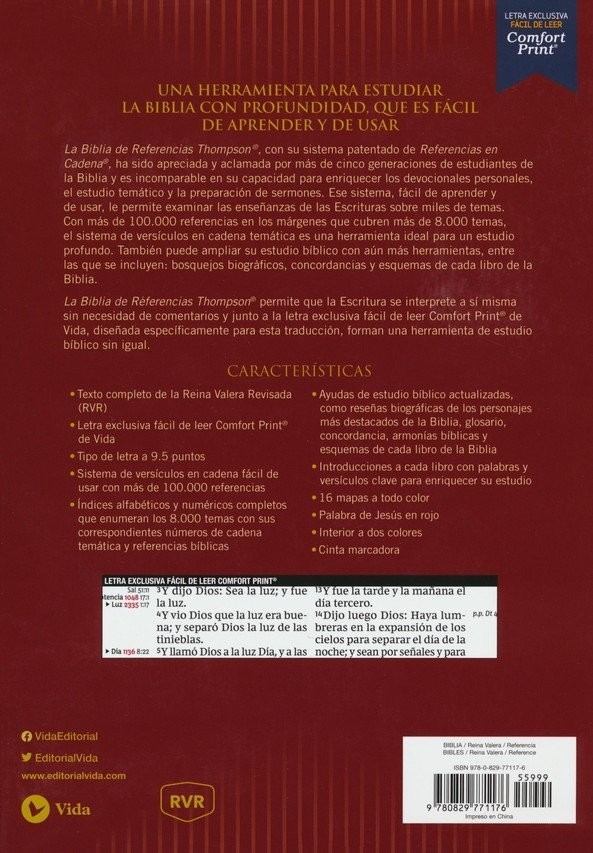 Con un sistema de referencia patentado, apreciado y aclamado por más de cinco generaciones, las Biblias de Referencia Thompson RVR no tienen comparación en su capacidad para enriquecer los devocionales personales, el estudio de temas y la preparación de sermones. Este sistema, fácil de aprender y de usar, le permite ver la amplitud de las enseñanzas de las Escrituras sobre miles de temas. Con más de 100.000 referencias listadas en los márgenes de la Biblia, que cubren más de 8.000 temas, el sistema de referencias en cadena es una herramienta ideal para el estudio exhaustivo de temas. También puede ampliar su estudio bíblico con más herramientas, incluyendo bosquejos biográficos y esquemas de cada libro de la Biblia. La Biblia de Referencias en Cadena Thompson permite que las Escrituras se interpreten a sí mismas sin necesidad de comentarios.