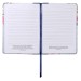 Un diseño de rayas desteñidas en marfil y azul claro recorre las cubiertas delantera y trasera del diario de piel sintética con tapa flexible. Los acentos florales en tonos de azul y rosa se colocan en dos esquinas opuestas de cada una de las cubiertas para agregar ráfagas de color femenino. En un verdadero estilo medio encuadernado, un lomo morado conecta las cubiertas y hace juego con el parche aplicado en la cubierta frontal que contiene el sentimiento plateado.