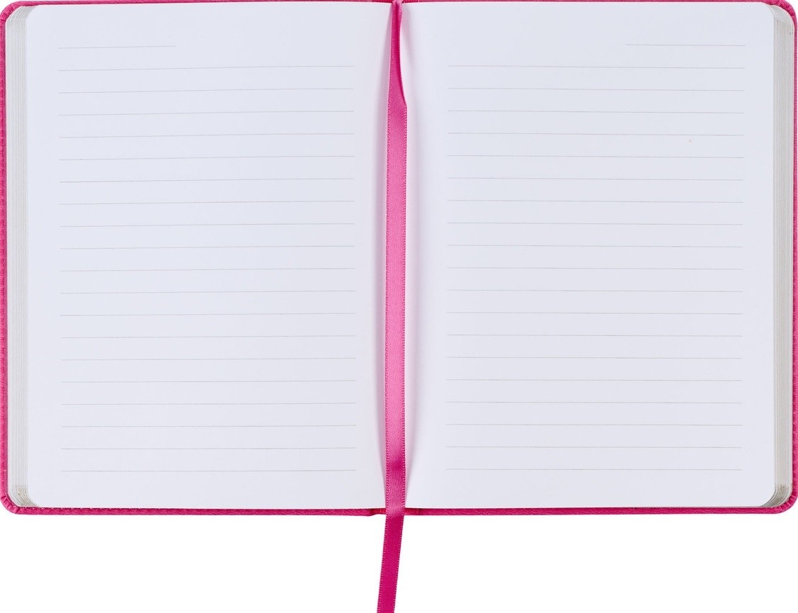 Se incluye un marcador de cinta rosa a juego para permitir una fácil ubicación y accesibilidad. El diario tiene 240 páginas con rayas blancas cremosas. Se incluye una pequeña línea punteada en la esquina superior exterior para registrar fechas y títulos de contenido. Los bordes dorados en los bordes de la página agregan brillo a un diseño divertido.