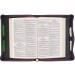 El rico panel posterior de color púrpura amatista oscuro del elegante estuche de la Biblia envuelve el lomo y se encuentra con un panel frontal de color crema con una doble fila de pespuntes. El panel frontal serigrafiado está decorado con un diseño de hoja con marca de agua y volutas de esquina doradas que enmarcan las letras moradas y doradas del sentimiento.
