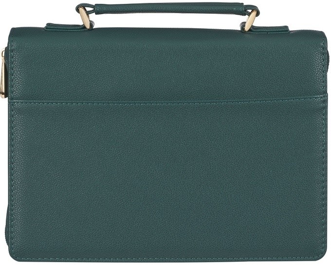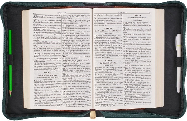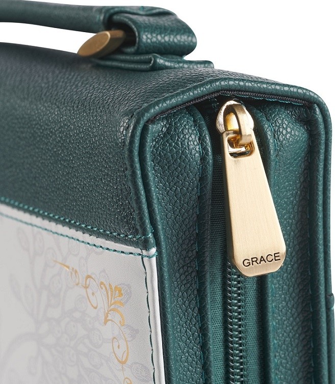 Una cremallera verde azulado con un tirador de metal dorado que está grabado con la palabra 'Grace', cierra la tapa y mantiene su Biblia y otros contenidos seguros y protegidos. Un asa plana está unida al lomo con herrajes de asa de metal dorado, y dos lazos para bolígrafos dentro del estuche le permiten llevar bolígrafos, resaltadores y lápices donde quiera que vaya su Biblia para tomar notas convenientemente.